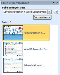 Sobald die Datei markiert ist, werden die Folien darunter angezeigt. Sie sehen eine kleine Vorschau und den Folientitel, wenn in der Präsentation ein Folientitel eingetragen wurde. Das ist beispielsweise nicht der Fall, wenn Sie das Folienlayout "Leere Folie" benutzt haben. Mit Klick auf die Folie wird diese eine Folie übertragen. |