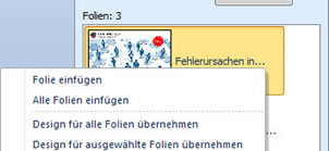 Wenn Sie alle Folien übernehmen wollen, klicken Sie eine beliebige Folie mit der rechten Maustaste an und wählen Sie "Alle Folien einfügen".