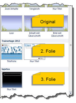 Im Menü "Neue Folie" sehen Sie anschließend die Folienmaster aller eingefügten Folien. Auch im Menü "Ansicht / Folienmaster" können Sie erkennen, welche zusätzlichen Folienmaster Sie übernommen haben. Das ist nicht per se schlecht, aber es ist mindestens unübersichtlich. Bei mehr als 10 zusätzlichen Mastern wird es aber auch Problem, denn es macht die Präsentation instabil. |