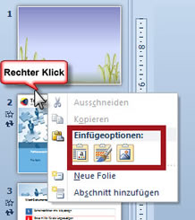 In der Zielpräsentation klicken Sie mit der rechten Maustaste Sie im linken Navigationsbereich zwischen zwei Folien. Sie erhalten mit "Einfügen" drei Optionen.