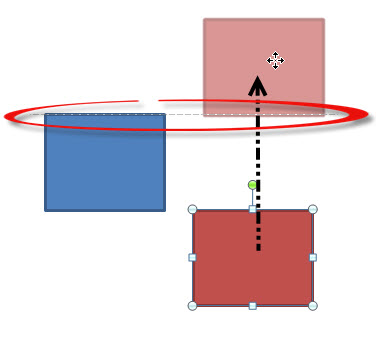 Das blaue Rechteck bleibt auf der Folie unverändert stehen. Das rote Rechteck steht unterhalb und wird nach oben verschoben. Sobald ich mit der Unterkante des roten Rechtecks auf der Höhe der Oberkante von blau bin, wird die intelligente Führungslinie eingeblendet (rot umrandet). Intelligente Führungslinie zeigen oben/unten und rechts/links an. |