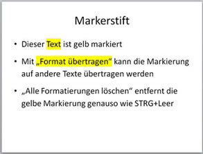 Auf der Folie haben Sie jetzt einen gelb markierten Text. Sie können diese Formatierung in PowerPoint mit "Format übertragen" auf andere Textstellen übertragen. Sie können die gelbe Formatierung löschen mit STRG+Leerschritt oder mit dem Symbol "Alle Formatierungen löschen" (vorher markieren!). |
