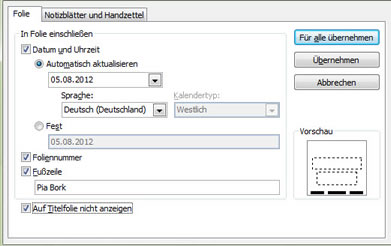 Mit "Für alle übernehmen" übertragen Sie die Fußzeile auf die bestehenden Folien; sie gilt auch für alle künftig zu erstellenden Folien. "Übernehmen" gilt nur für die aktuelle Folie.
