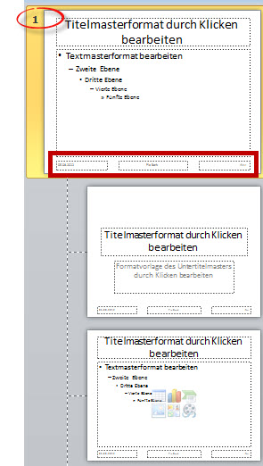 Es gibt drei Platzhalter für Datum, Fußzeile und Foliennummer. Falls einer davon fehlt, können Sie ihn über "Folienmaster / Masterlayout" aktivieren. Um die Felder anders zu platzieren, müssen Sie zuerst überlegen, ob die Änderung für jedes Folienlayout oder nur für ein bestimmtes gelten soll. Änderungen für alle Folienlayout müssen unbedingt auf dem "Super"-Master gemacht werden; das ist der Folienmaster, der über allen anderen steht und etwas größer ist als der Rest. Er trägt eine Nummer - hier bei mir ist es der erste, die Nummer 1. Änderungen für einen bestimmten Folienmaster machen Sie auf dem speziellen Master - zum Beispiel auf dem für das zweispalte Layout.
