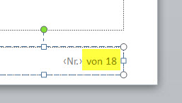 Wer unbedingt die Gesamtfolienzahl in der Präsentation benötigt, kann hier das Feld "Nr" verwenden. Schreiben Sie hinter den Platzhalter "Nr" von Hand die Gesamtfolienzahl (hier gelb markiert). Achtung! Die Gesamtfolienzahl wird sich niemals aktualisieren. |