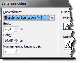 PowerPoint hat in allen Version bis einschließlich 2010 als Basisgröße der Folie 25,4 cm x 19,05 cm. Das entspricht einem Seitenverhältnis von 4:3. Andere Verhältnisse sind 16:9 oder 16:10.