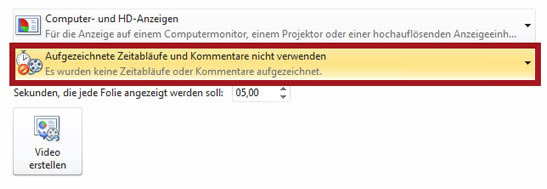 Wählen Sie "Zeitabläufe und Kommentare aufzeichnen", damit Sie die Zeitdauer festlegen können. In ganz einfachen Präsentationen können Sie auch unter dieser Liste einstellen, dass jede Folie gleichermaßen lang erscheint - alles 10 Sekunden. Das ist aber selten möglich. |