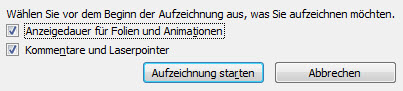 Wenn Sie gesprochene Kommentare aufzeichnen wollen, haken Sie "Kommentare und Laserpointer" an. Nur dann lässt sich auch der Laserpointer aufzeichnen, der mit STRG+linker Maustaste erzeugt wird. Ein Klick auf "Aufzeichnung starten" beginnt die Aufzeichnung.