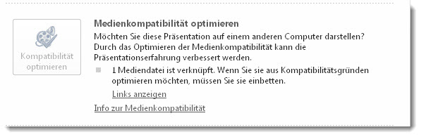 Klicken Sie auf "Datei | Informationen | Kompatibilität optimieren - Links anzeigen". Wählen Sie dann "Verknüpfung aufheben". Damit werden verknüpfte Videos in eingebettete umwandeln.