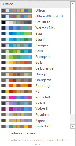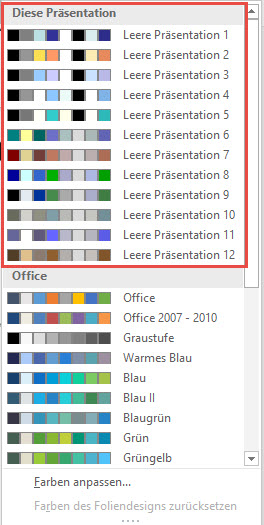 Alte Präsentationen und Präsentationsvorlagen aus PowerPoint 2003 und älter bringen Farbpaletten mit, die den Anwender eher verwirren als helfen.