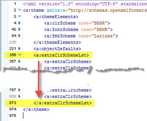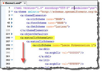 Öffnen Sie mit einem XML-Editor die Datei "theme\theme1.xml" und suchen Sie den Beginn <a:extraClrSchemeLst>.