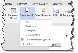 Kopf- und FußzeileSchneller fügen Sie jetzt den Dateinamen oder -pfad ein. Im Register "Kopf- und Fußzeilentools / Entwurf" finden Sie das Symbol "Dokumentinfo" mit den wichtigsten Feldern und einem direkten Zugriff auf die Dokumenteigenschaften und alle weiteren Felder.