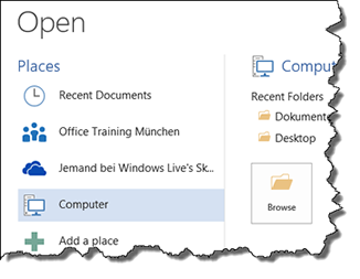 Dateien öffnen und speichern"File / Open" bietet neben dem bekannten "Recent Documents" und der Suche auf dem Computer auch direkten Zugang zu Windows Live Skydrive sowie zu Office 365-Speicherorten - auf Wunsch. Das kann mit "Add a place" konfiguriert werden. |