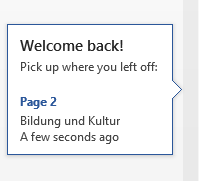 Welcome back!Beim Öffnen eines Dokumentes wird in der vertikalen Bildlaufleiste die Position angezeigt, an der man vor dem Schließen gearbeitet hat. Mit einem Klick landet man an dieser Stelle. |