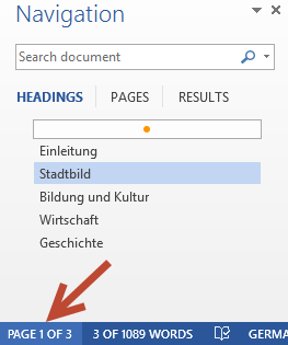 NavigationsbereichEin Klick auf die Anzeige "Seite x von y" in der Statusleiste blendet den Navigationsbereich ein und aus. Als oberster Befehl über den Überschriften ist ein noch nicht mit Symbol versehener Bereich (orangefarbener Punkt): Jumping to the begin - also ein rascher Klick für den Sprung an den Dokumentenanfang. |