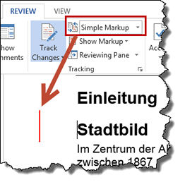 Der "Simple Markup"-Modus reduziert die angezeigten Änderungen auf den Strich am linken Rand - die Ansicht "All markups" zeigt wie gewohnt gelöschte und hinzugefügte Texte an.