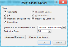 Die Optionen für den Änderungsmodus werden über das Startprogramm für Dialogfelder aufgerufen, nicht mehr über einen Befehl. Die Dialogbox fasst zusammen, was früher Optionen, Markup anzeigen und Benutzernamen waren. Mit "Advanced Options" wird der Dialog aufgerufen, in dem sich die Farben einstellen lassen.