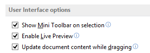 Eingestellt wird das Ganze unter "File / Options / General" und heißt "Update document content while dragging".