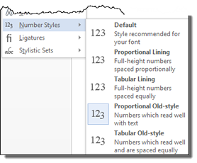 TexteffekteFür die Texteffekte (das alte "WordArt") sind neu sind Number Style, Ligatures und Stylistic Sets. Number Styles setzt Ziffern enger oder mit leichtem Hoch-Tief-Versatz. |