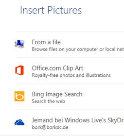 Fülleffekt BildFür Formen wird beim Befehl "Format / Shape Fill / Picture" standardmäßig neben den lokalen Ordnern auch die Web-Suche angeboten. Damit es schneller geht, kann man im Dialog gleich auf "Work offline" klicken und landet dann nur auf den lokalen Ordnern. |