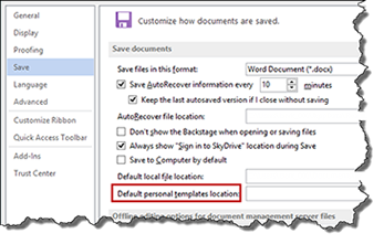 VorlagenpfadDer Pfad zu den eigenen Vorlagen wird unter "File / Options / Save" eingestellt: das ist die "Default personal templates location". Arbeitsgruppenvorlagen werden nach wie vor unter "File / Options / Advanced" eingetragen.