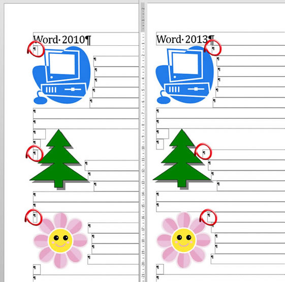 Unten sehen Sie links die Anordnung bis Word 2010 und daneben die Anordnung in Word 2013. Die Absatzmarken, die anders platziert werden, habe ich rot umrandet.