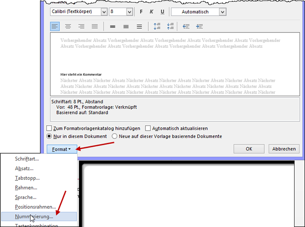 Im nächsten Dialogfenster klicken Sie unten links auf die Schaltfläche Format und danach auf Nummerierung und bestimmen das gewünschte Nummernformat z.B. 1. 2. 3. usw. oder