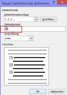 Sie erstellen eine eigene Nummerierungsart, indem Sie auf Neues Zahlenformat definieren klicken und im Feld Zahlenformat die gewünschte Darstellung erfassen. |
