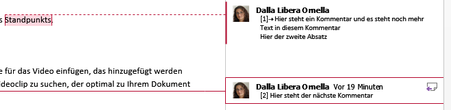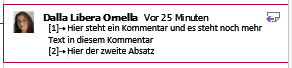 Nun steht vor jedem Textabsatz in einem Kommentar eine Nummer. Falls Sie in einem Kommentartext ein ENTER machen, dann kriegt der neue Absatz eine weitere Nummer. (Mit CTRL+TABULATOR kann der Text nach der Nummer nach rechts 'geschoben' werden). |