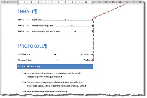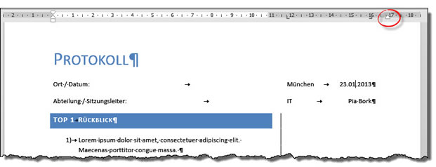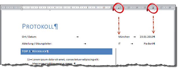 Unten sehen Sie ein Beispiel aus Word 2010 für die Anordnung. Ich habe eine Protokollvorlage mit einem sehr breiten rechten Rand - für handschriftliche Anmerkungen (ja, das ist so!). Das Inhaltsverzeichnis sowie Datum und der Name des Sitzungsleiters sollen aber die gesamte Seitenbreite nutzen. Darum wird ein rechtsbündiger Tabulator auf 16 cm platziert.