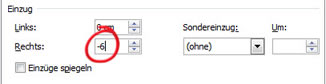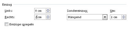 Danach: Absatzeinzug von rechts z. B. 2 cm Hängend 1 cm |