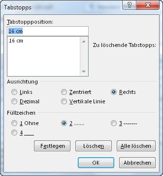 ACHTUNG - Ergänzung vom Juli 2016! Der Tabulator darf seit Neuestem nicht mehr exakt auf dem Seitenrand sitzen. Sie müssen den Seitenrand um 1 mm nach rechts verschieben - statt Rand rechts 2 cm setzen Sie also einen Rand rechts von 1,99 cm. Oder Sie setzen den Tab nicht auf 16 cm sondern auf 15,99 cm.