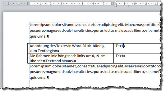 Bis Word 2010 werden Tabellentexte bündig zum Textbeginn der Absätze ausgerichtet, die Tabellenrahmenlinien hängt 0,19 cm links heraus.