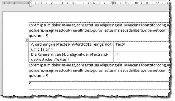 In Word 2013 werden die Tabellenrahmen bündig zum Text ausgerichtet und die Texte entsprechend um 0,19 cm eingerückt.