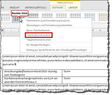 Setzen Sie den Cursor in eine der Tabellen. Wählen Sie "Tabellentools / Entwurf" und suchen Sie oben die Tabellenformatvorlage, die in Verwendung ist - sie wird mit einem Rahmen hervorgehoben. Klicken Sie sie mit der rechten Maustaste an. Wählenm Sie "Tabellenformat ändern". |