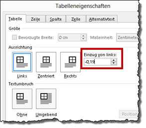 Tragen Sie auf dem Register "Tabelle" als Einzug von links ein: -0,19 Minsuzeichen nicht vergessen! Alles mit OK bestätigen. |