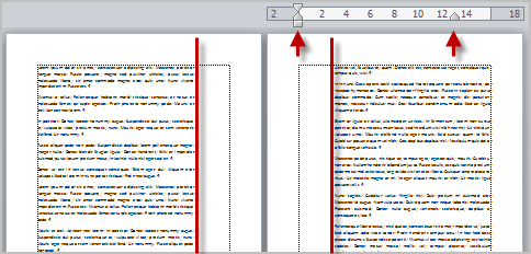 Beachten Sie auf der zweiten Seite den Widerspruch zwischen der Anzeige im Lineal und der tatsächlichen Ausrichtung! Der linke Einzug wird (korrekterweise) bei 0 cm gezeigt, obwohl der linke Einzug tatsächlich verschoben ist - der rechte Einzug wird als verschoben dargestellt, obwohl der Text bis zum rechten Seitenrand hinausragt.