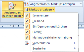 Markups oder Änderungskennungen können komplett oder teilweise ausgeblendet werden. Sie erreichen damit, dass beispielsweise Formatänderungen nicht angezeigt werden oder nur die Änderungen eines bestimmten Bearbeiters gekennzeichnet werden.