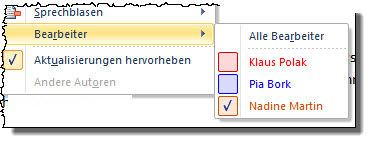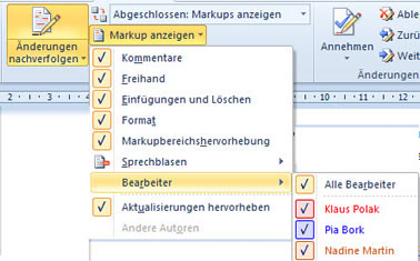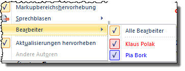 Mit "Markup anzeigen / Bearbeiter" können Sie sehen, wer im Dokument gearbeitet hat, welche Farbe ihm zugewiesen wurde und Sie können einzelne Bearbeiter ausblenden.