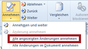 Wählen Sie den unteren Teil des Symbols "Annehmen" und klicken Sie auf "Alle angezeigten Änderungen annehmen". Das geht natürlich mit "Ablehnen - Alle angezeigten Änderungen ablehnen". |