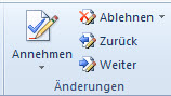 In der Gruppe "Änderungen" können Sie mit den beiden Schaltflächen "Zurück" und "Weiter" auf Änderungen springen. Dabei werden auch Kommentare angesprungen.