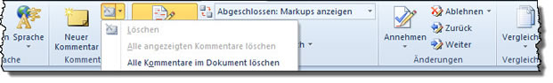 Vom Annehmen/Ablehnen ausgenommen sind Kommentare. Sie können Kommentare einzeln löschen: mit der rechten Maustaste auf dem Kommentar oder bei einem markierten Kommentar mit "Überprüfen / Kommentare / Löschen".
