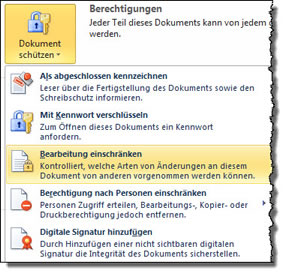 | Genauso geht es über "Datei / Informationen / Dokument schützen / Bearbeitung einschränken". |