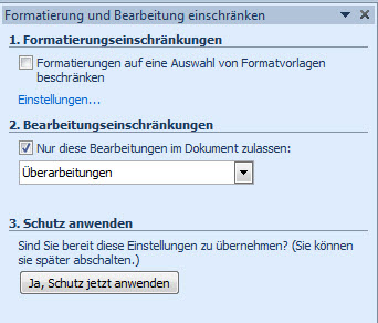 Wählen Sie unter "2. Bearbeitungseinschränkungen" den Punkt "Überarbeitungen" aus. Klicken Sie dann bei "3. Ja, Schutz jetzt anwenden". Sie werden zur Eingabe eines Passwortes eingefügt. Geben Sie das Passwort ein und bestätigen Sie es durch erneute Eingabe. |