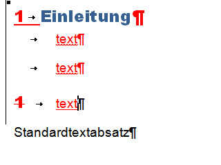 Der Änderungsmodus wird aktiviert und nach "Einleitung" wird erneut Enter gedrückt. Jetzt wird kein Standardabsatz eingefügt, sondern eine Überschrift mit der Ziffer 1, die aber sofort wieder gelöscht wird. Die Einrückung bleibt erhalten.