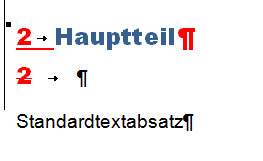 Ausgangssituation: Es sind nummerierte Überschriften definiert, auf die ein Standardabsatz folgt. In der Formatvorlage "Überschrift1" ist definiert "Formatvorlage für folgenden Absatz: Standard". Ohne Änderungsmodus wird nach der Überschrift der Standardabsatz sofort erzeugt. |