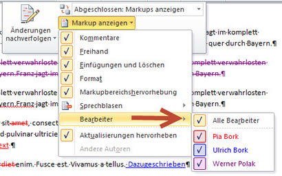 Im Dokument 1 sind Änderungen eines Sachbearbeiters (Werner Polak), in Dokument 2 gibt es zwei Namen (Pia Bork, Ulrich Bork). In beiden Dokument ist der Änderungsmodus zum Kopieren/Einfügen ausgeschaltet. Wenn Sie im Zieldokument das "Änderiungen nachverfolgen" nicht auf "Aus" stellen, wird der gesamte eingefügte Text als "neu eingefügt" markiert - dabei bleiben die Markups ebenfalls erhalten.