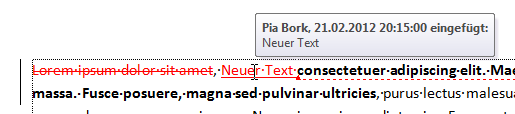 Im Änderungsmodus (Überarbeitenmodus) werden die Namen des Bearbeiters sowie das Datum der Änderungen aufgelistet. Sie sehen im Beispeil, dass Pia Bork am 21.02.2012 um 20:15 einen Text eingefügt hat.