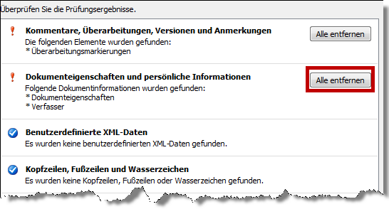 - Klicken Sie neben "Dokumenteigenschaften und persönliche Informationen" auf die Schaltfläche "Alle entfernen"