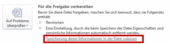 Gehen Sie noch einmal in das Menü "Datei / Information". In der Rubrik "Auf Probleme überprüfen" ist jetzt ein Link erscheinen "Speicherung dieser Informationen in der Datei zulassen". Klicken Sie ihn an. Damit wird die Eigenschaft deaktiviert, der Link verschwindet und ab sofort werden die Namen, das Datum und die Uhrzeit wieder protokolliert.
